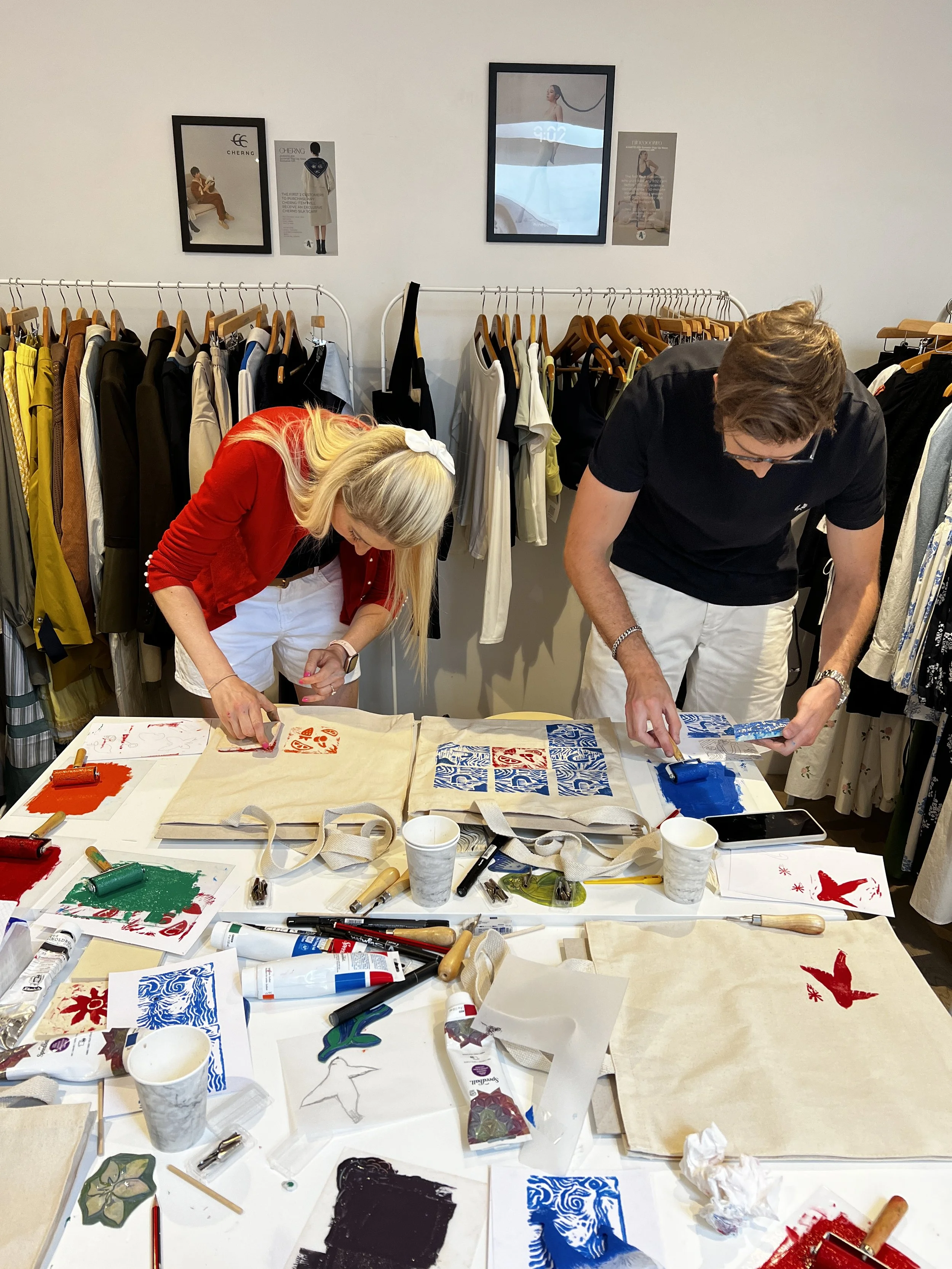 Atelier de linogravure imaginé spécialement pour un pop-up store londonien mettant en avant des marques textiles éco-responsables. Pour faire écho à l’esprit du lieu, partagé par plusieurs marques de mode londoniennes, j’ai conçu une expérience où les participants ont créé leur propre tampon de linogravure à partir de leur dessin personnel, avant d’imprimer leur motif sur un tote bag.